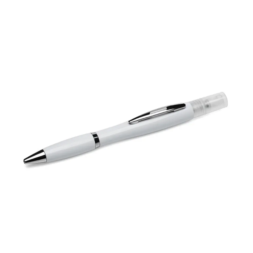 Cuerpo y grip plástico blanco, clip metálico y punta gris metalizado, con contenedor spray.