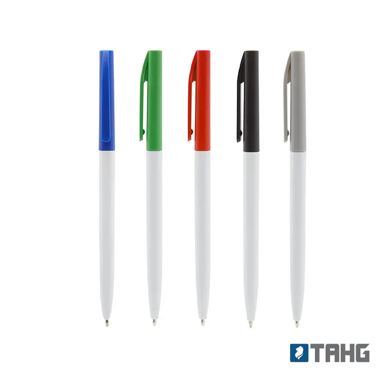 Bolígrafo con cuerpo plástico blanco. Clip de color. Apertura de medio giro. Tinta negra. Tahg