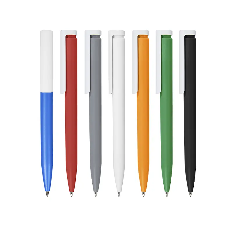 Bolígrafo plástico de cuerpo de color sólido y clip en color blanco. Apertura con pulsador. Tinta Negra 1000 m de longitud de escritura. Zecat