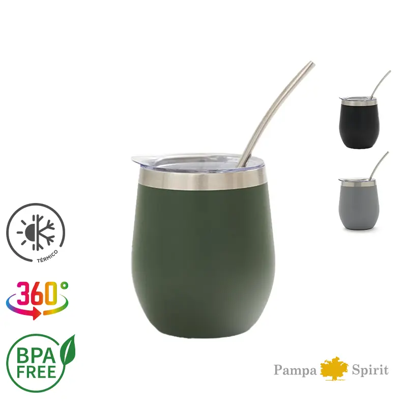 Mate confeccionado en doble pared de acero inoxidable 304. Cuenta con tapa antiderrame y bombilla de acero. Capacidad: 220 ml. Producto libre de BPA. Pampa Spirit. Incluye GiftBox confeccionada en cartulina Kraft ¡personalizala con un mensaje especial!