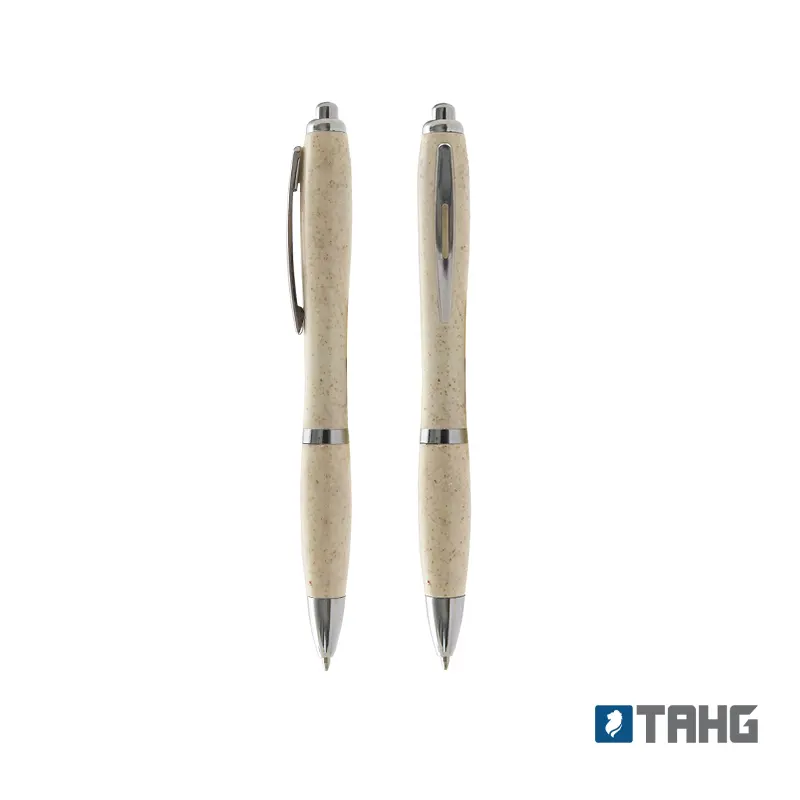 Bolígrafo sustentable color beige. Hecho a base de WheatStraw, pasta de tallo de trigo, un material sustentable que reduce el consumo de plásticos vírgenes. Ideal para tener a mano y estar siempre preparado para anotar, escribir, firmar, etc. Tahg