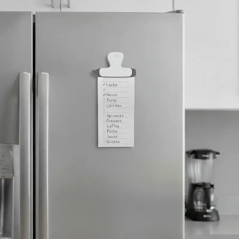 Clip magnético blanco y gris. Hecho de poliestireno (PS) y magneto. Cuenta con diseño ergonómico con imán trasero, pinza de agarre firme y superficie plana con detalles en gris. Es ideal para sujetar papeles, cerrar bolsas o adherirse al refrigerador para dejar recordatorios o notas. Tahg.