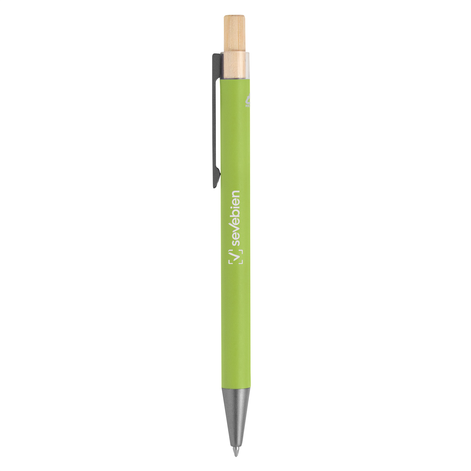 Elegancia y sostenibilidad. Bolígrafo retráctil. Cuerpo metálico en diferentes colores acabado mate. Clip metálico y puntera plástica color gris acabado mate. Pulsador de bambú.Medidas: 14 cm. Materiales: Aluminio reciclado y bambú. Peso: 17 g. Tinta: negra.
