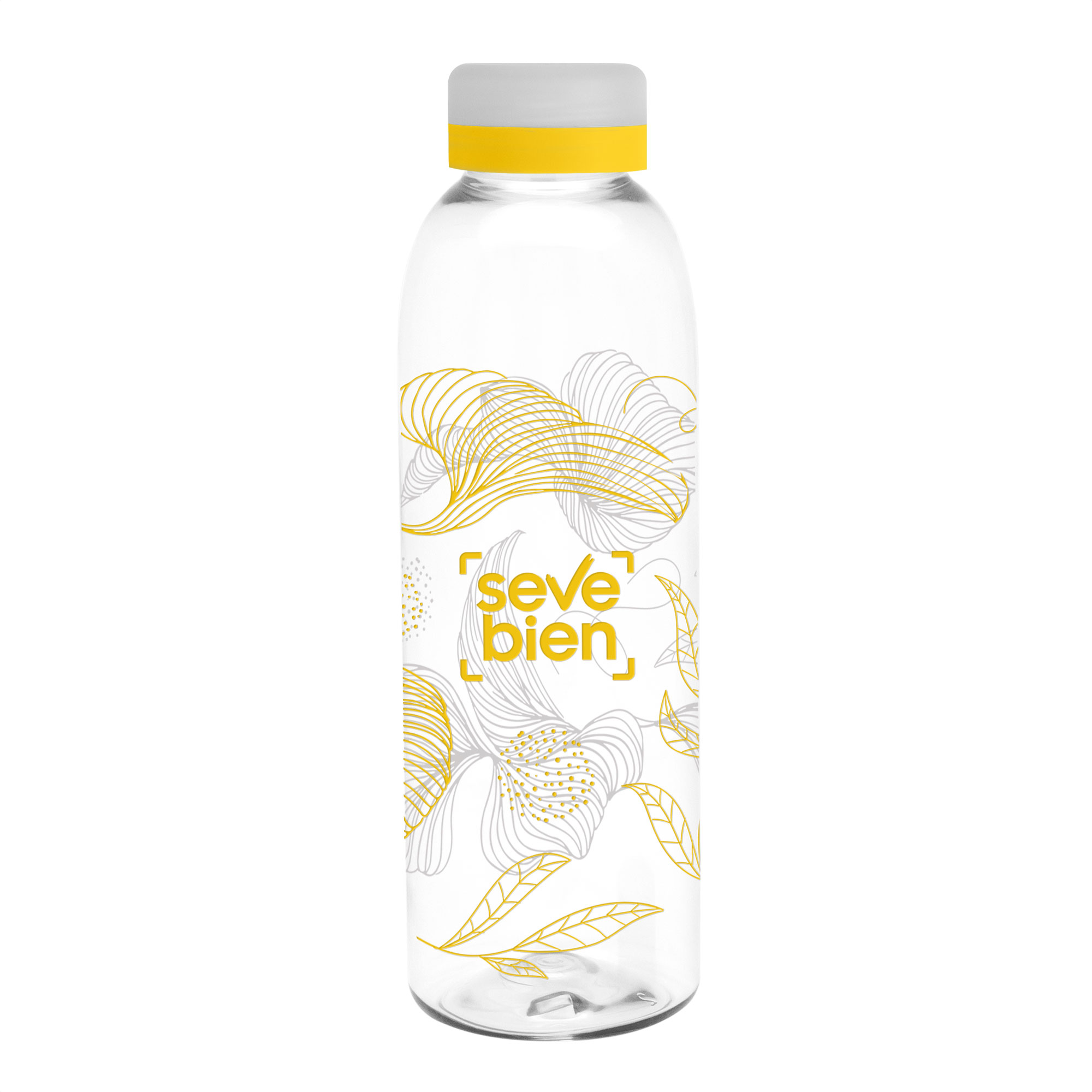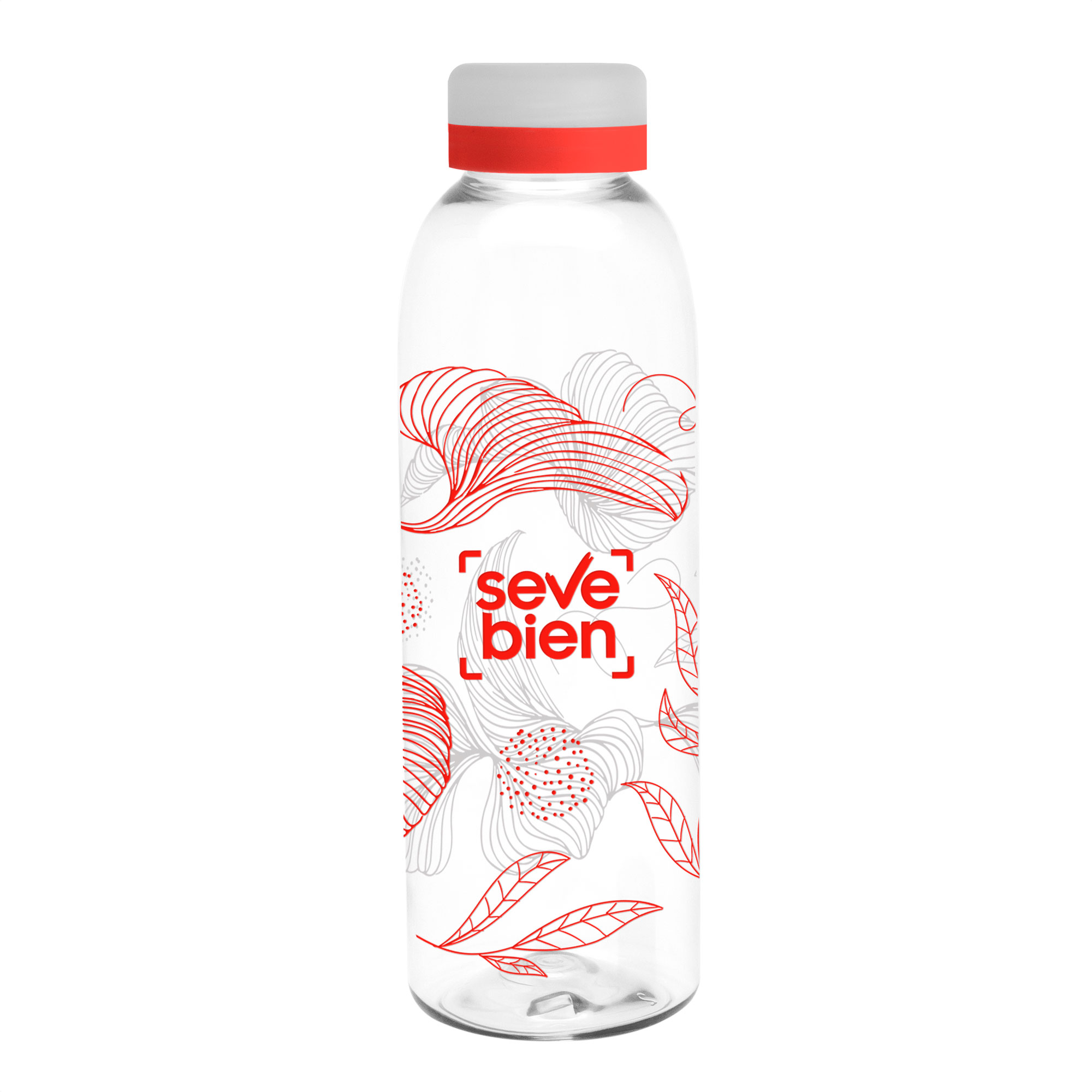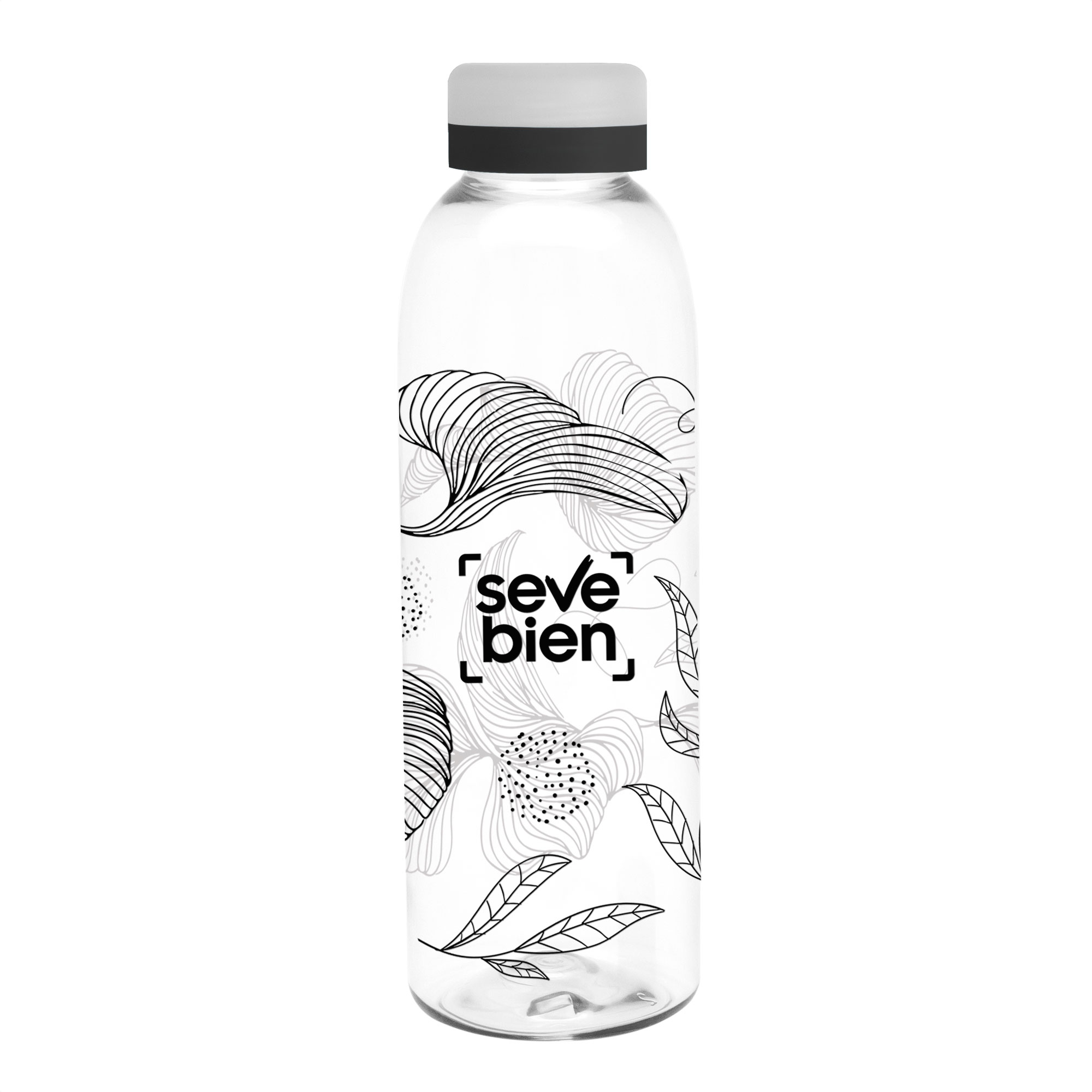 Diseño práctico para un uso diario.Botella de plástico transparente con tapa a rosca esmerilada con anillo de silicona de diferentes colores.Medidas: Ø 7 x 23 cm. Capacidad: 700 ml. Peso: 70 g. (botella) y 15g. (tapa) Materiales: PET Cristalino.