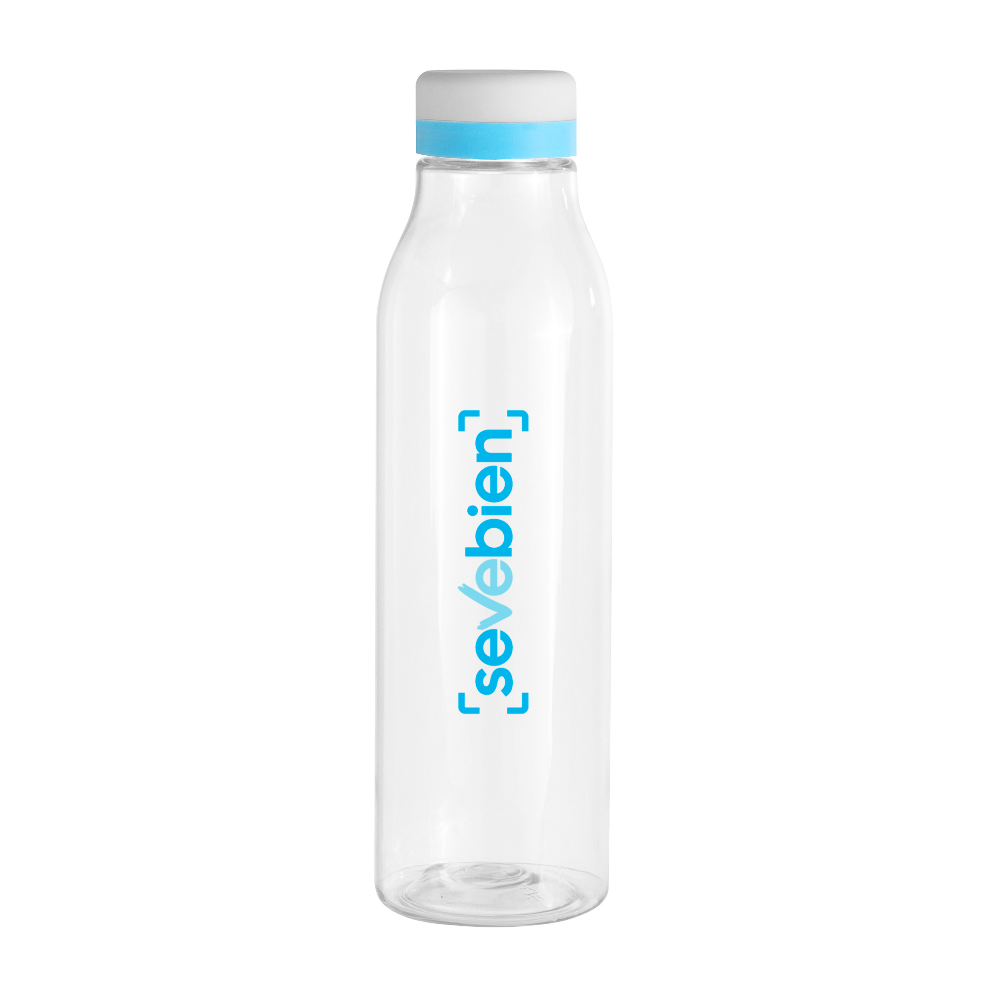 Ligera y Duradera.Botella de plástico transparente con tapa a rosca color blanco mate con anillo de silicona de diferentes colores.Medidas: Ø 7 x 24,5 cm. Capacidad: 750 ml. Peso: 70 g. (botella) y 15g. (tapa) Materiales: PET Cristalino. ATENCIÓN Botella, tapa y banda de silicona se entregan por separado. / No utilizar con bebidas gaseosas ni líquidos calientes. / El manejo de este producto es delicado. / No exponer al sol y temperaturas altas por tiempo prolongado.