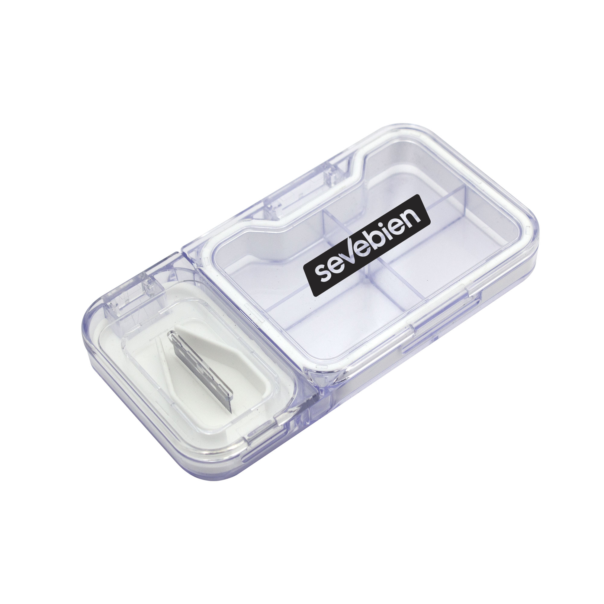 Compacto, práctico y seguro.Pastillero organizador corta pastilla. Compartimento principal con cuatro divisiones y recubrimiento perimetral de silicona. Compartimento secundario con base de silicona y soporte regulable de pastillas. Cuchilla de acero incorporada en la tapa. Ambos compartimentos con tapa rebatible y cierre a presión.Medidas: 12 x 6,3 x 1,8 cm Materiales: Plástico AS, silicona y acero inoxidable 420J2 (grado alimenticio) Peso: 71,3g